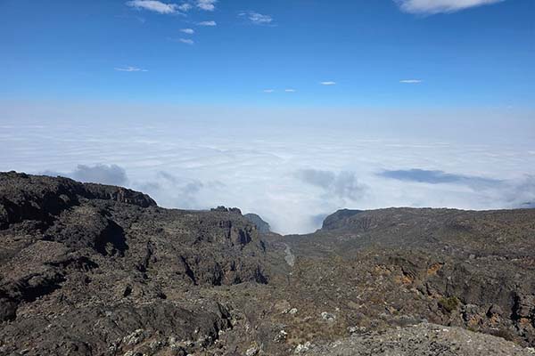From the Shira Plateau we continue to the east up a ridge, passing the junction towards the peak of Kibo. As we continue, our direction changes to the South East towards the Lava Tower, called the “Shark’s Tooth” (elev 4650m/15,250ft). Shortly after the tower we come to the second junction which goes to the Arrow Glacier. We now continue down to the Barranco Camp. Although you end the day around the same elevation as when you began, this day is very important for acclimatization and will help your body prepare for summit day.