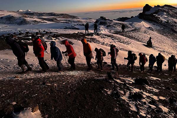 Very early in the morning (midnight to 2 am), we continue our way to the summit between the Rebmann and Ratzel glaciers. You head in a northwesterly direction and ascend through heavy scree towards Stella Point on the crater rim. This is the most mentally and physically challenging portion of the trek. At Stella Point you will stop for a short rest and will be rewarded with the most magnificent sunrise you are ever likely to see. Faster hikers may view the sunrise from the summit.
