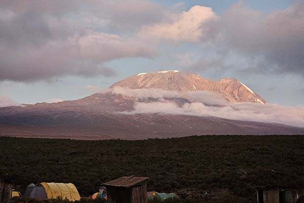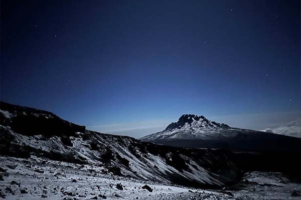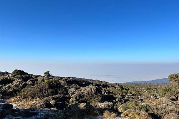 Ascending, we now pass the last watering point, walking onto the saddle of Kilimanjaro between the peaks of Kibo and Mawenzi. Vegetation begins with upper heathland but then disappears into “moonscape”. Dinner, rest, and prepare for summit climb.