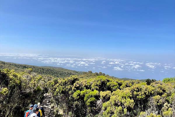 You leave the glades of the rain-forest and follow an ascending path on the open moorlands to the Horombo encampment. Views of Mawenzi and the summit of Kibo are amazing. Look for giant lobelias and grounsels. You may begin to feel the affects of the altitude.